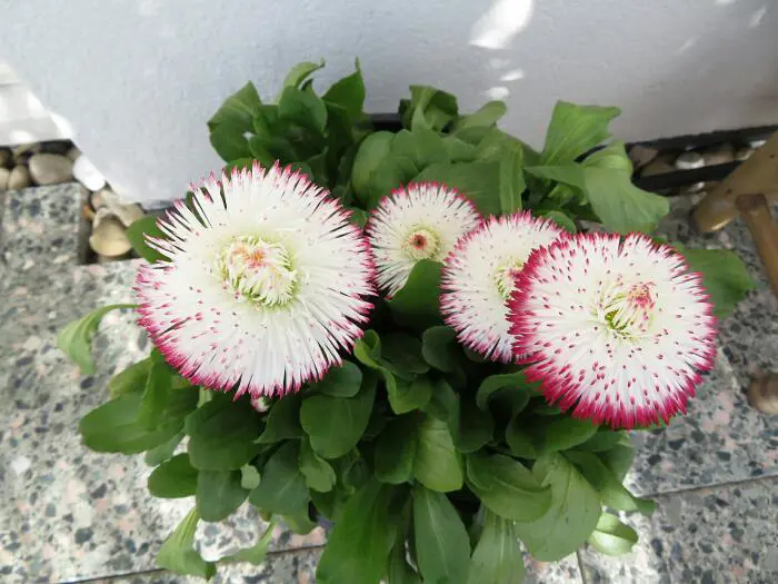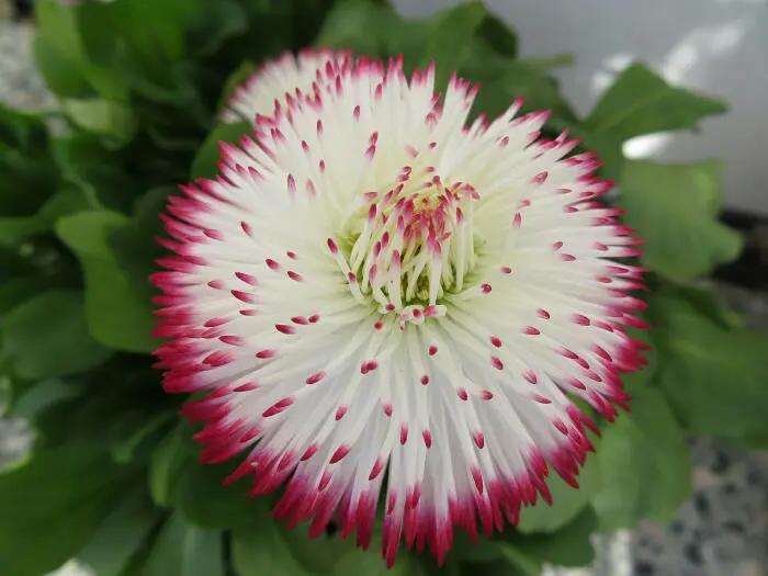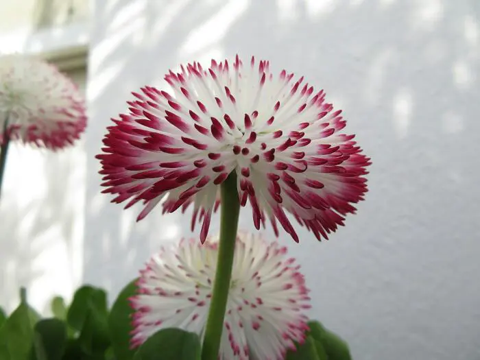Bellis perennis 'Pomponette' bloeit met tweekleurige roze en wit, pomponachtige bloemen.