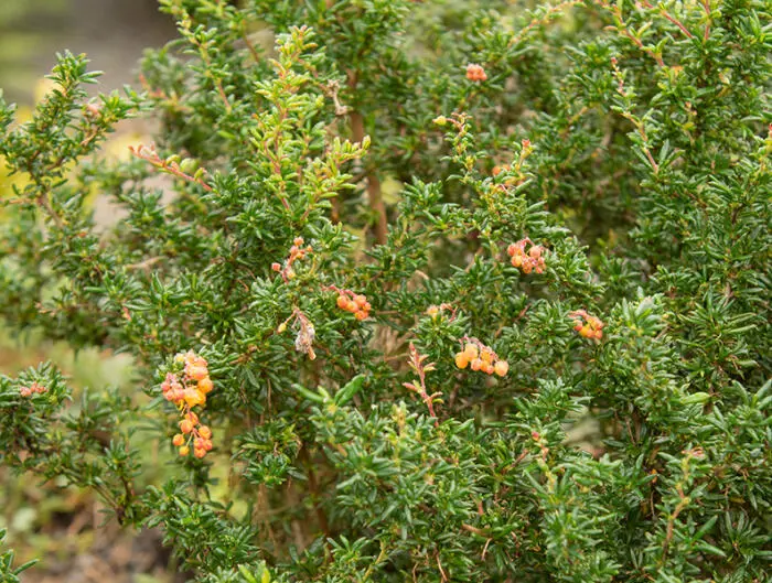 Berberis x stenophylla is een traaggroeiende, doornige, compacte struik met overhangende takken en smalle, glanzende diepgroene blaadjes met een blauwgroene onderkant.