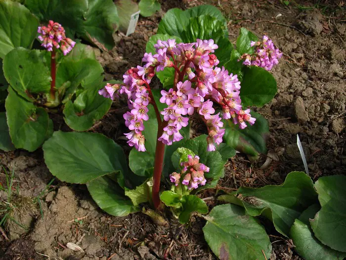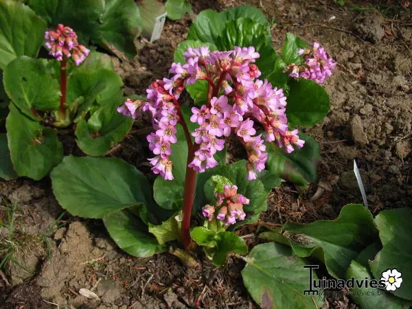 Bergenia 'Eden's Dark Margin' is een vroegbloeiende schoenlappersplant met rozerode bloei en donker burgundy/bronsgroene bladeren.
