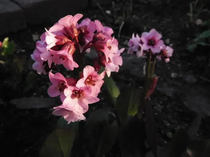 Bergenia DRAGONFLY 'Angel Kiss' bloeit met bleekroze tot wit verkleurende bloempjes.