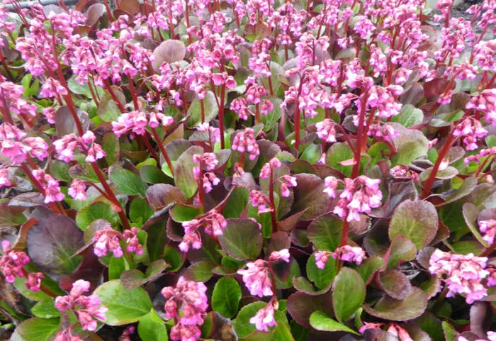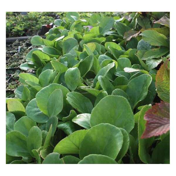Bergenia 'Rosi Klose' bloeit lichtroze met groen in het hart. Bloeit zeer lang door van mei tot augustus.