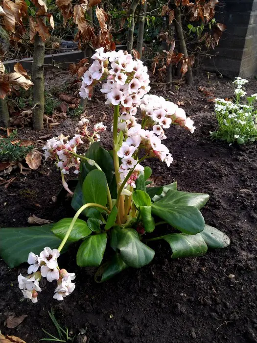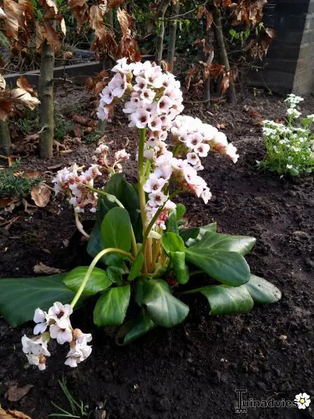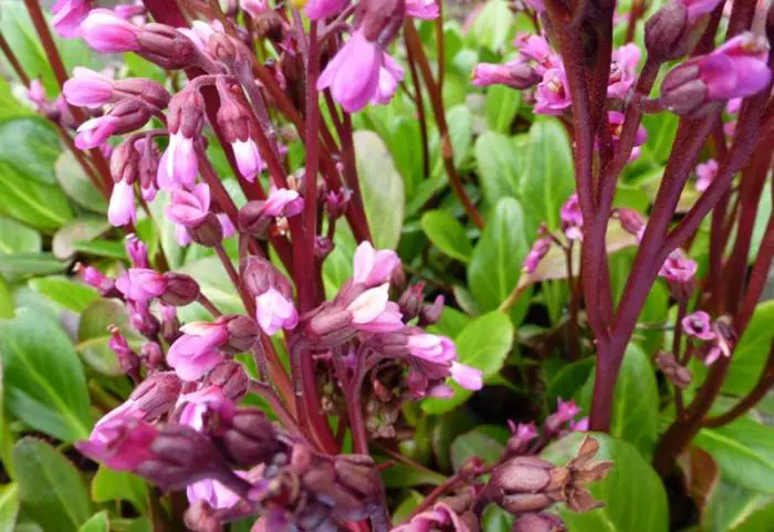 Bergenia 'Wintermärchen' bloeit rozerood en heeft smaller blad dan de soort. Bloeit in de lente, maar af en toe geeft hij in de zomer nog eens een bloem.