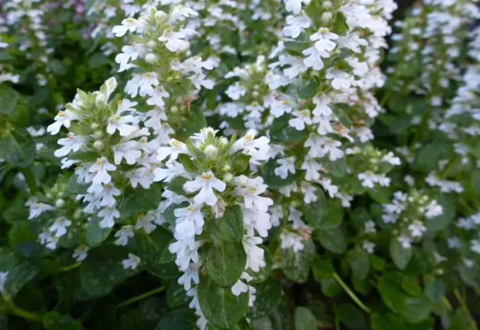 Ajuga reptans 'Alba' is een kruipende vaste plant met korte aren samengesteld uit kleine witte bloemen