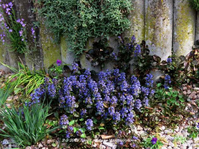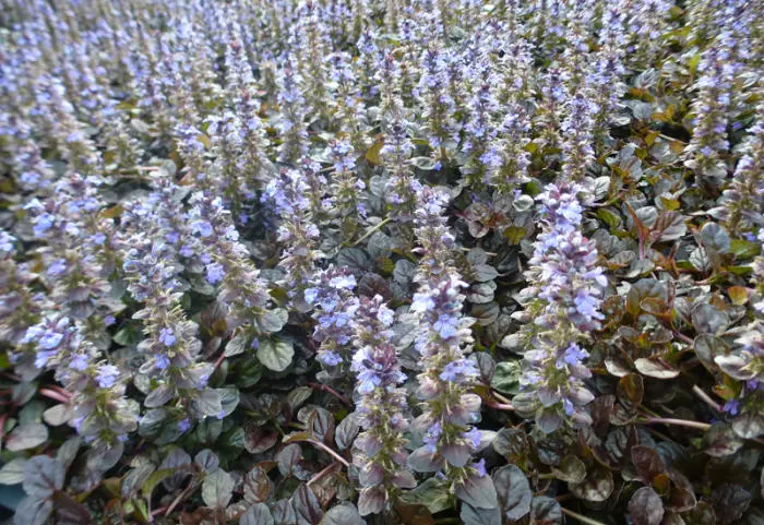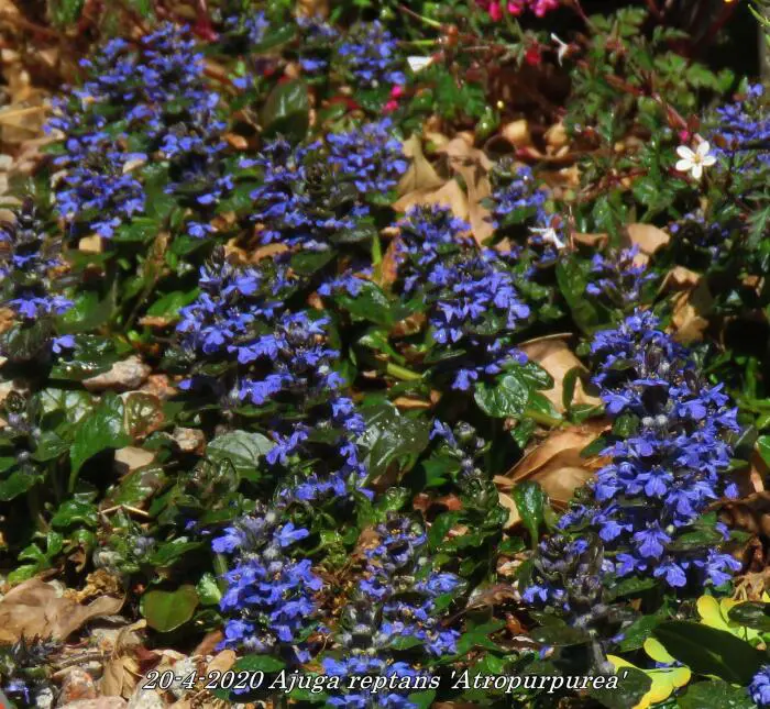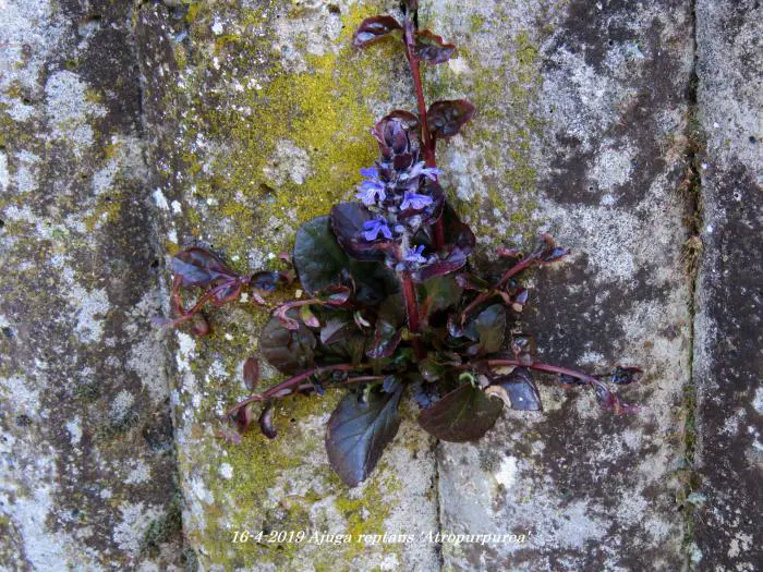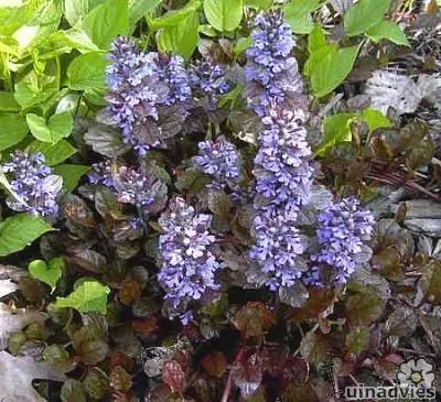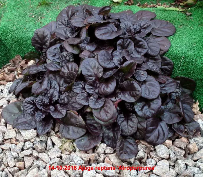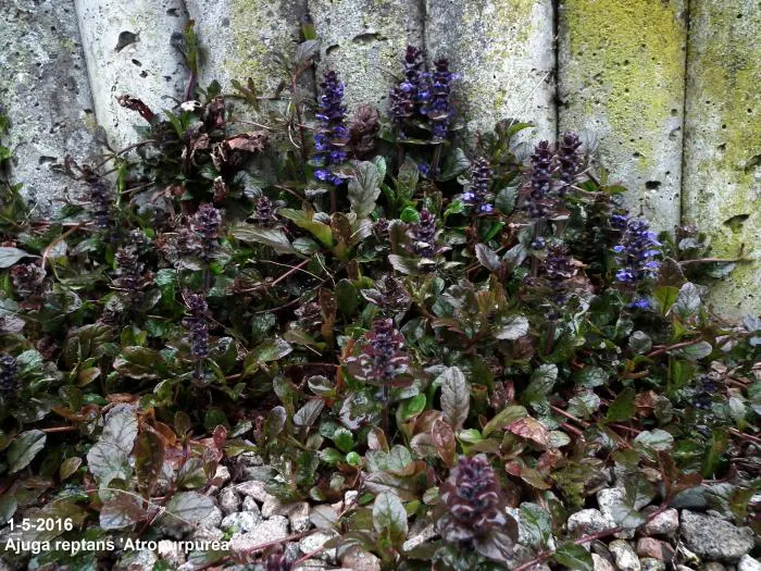 Ajuga reptans atropurpurea is een kruipende vaste plant met korte aren samengesteld uit kleine donkerblauwe bloemen