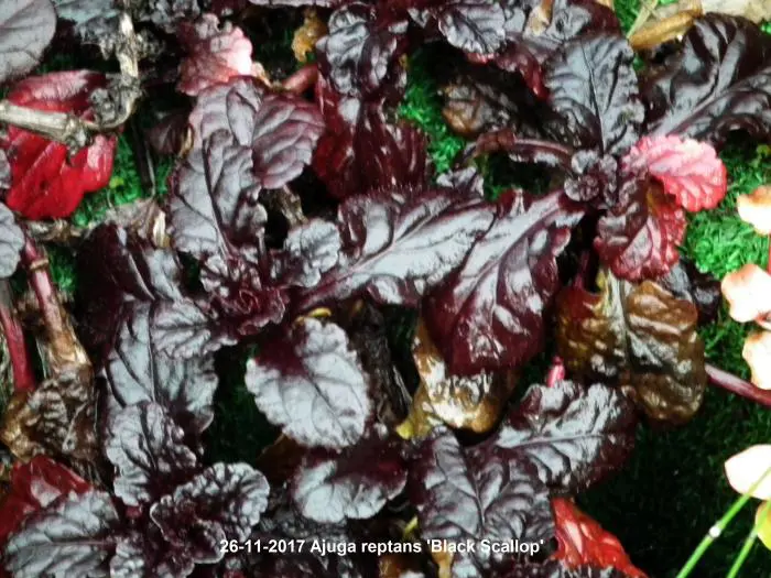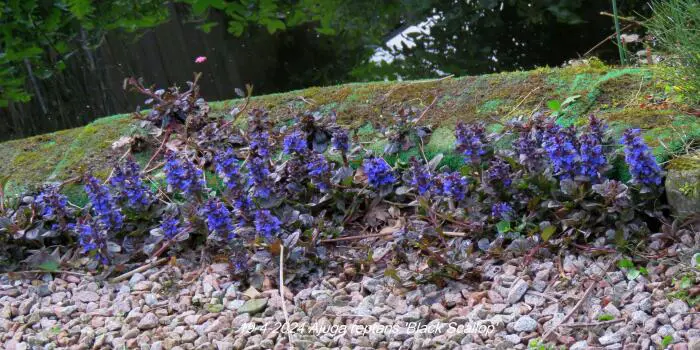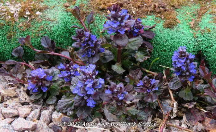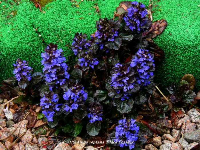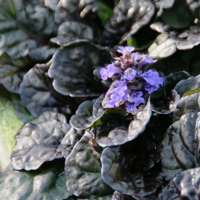 Ajuga reptans 'Black Scallop' is een kruipende vaste plant met korte aren samengesteld uit kleine donkerblauwe bloemen.