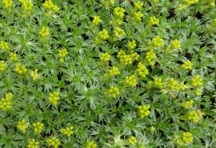 Azorella trifurcata 'Nana' is een pollenvormende plant met donkergroene, glanzende bladeren en nietige geelgroene bloempjes.