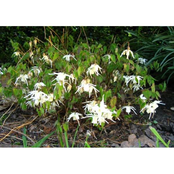 Epimedium 'Creeping Yellow' bloeit met (gelig)witte bloemen op fijne stelen.