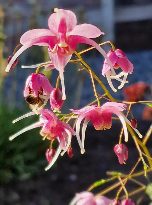 Epimedium 'Pretty In Pink' is een hybride van E. grandiflorum. Het is een bodembedekkende plant met hartvormige bladeren die het voorjaar bronspaars verschijnen en geleidelijk in de zomer verkleuren naar heldergroen en dan terug naar bronspaars in het najaar.