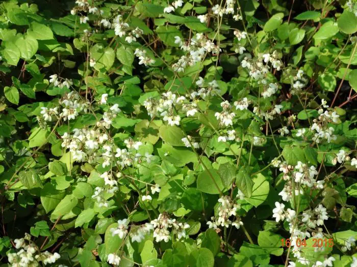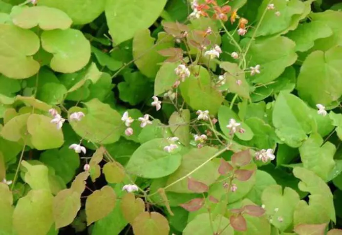 Epimedium pubigerum heeft groenblijvende groene bladeren.