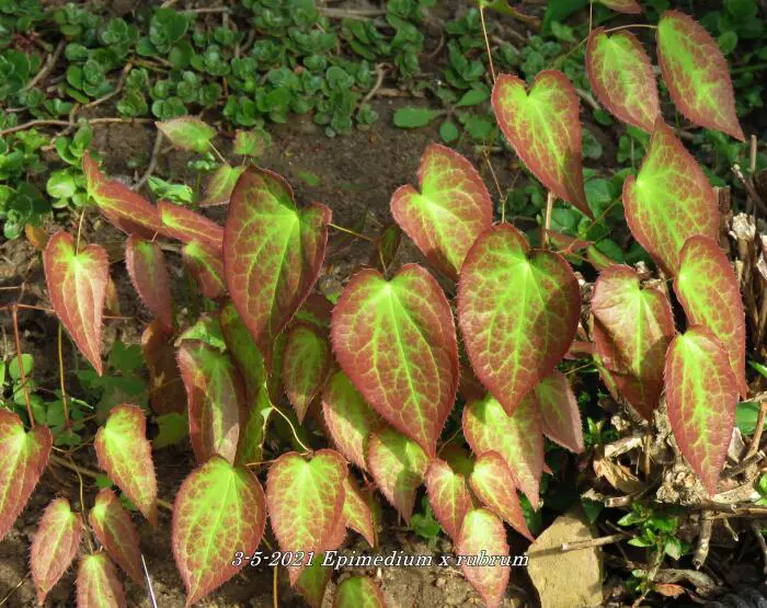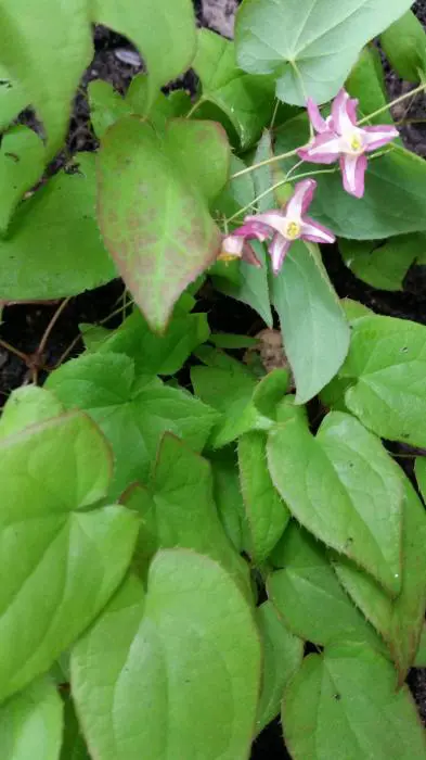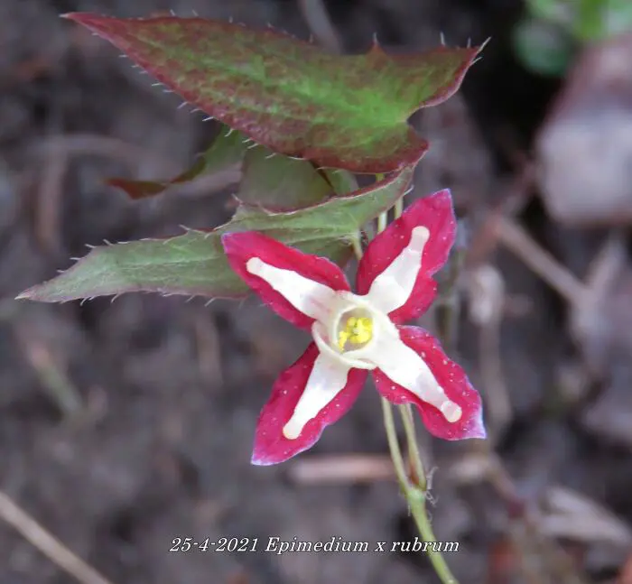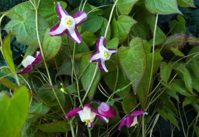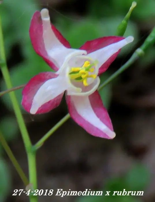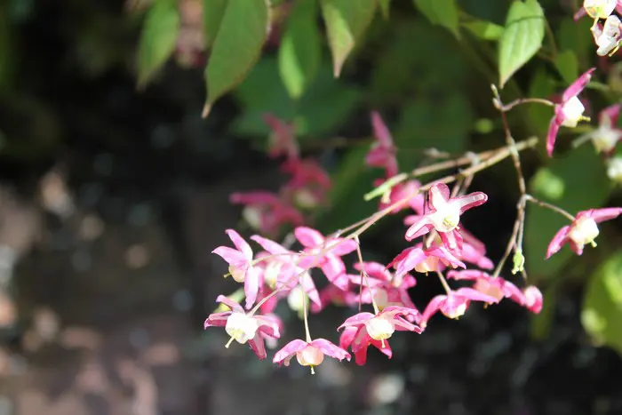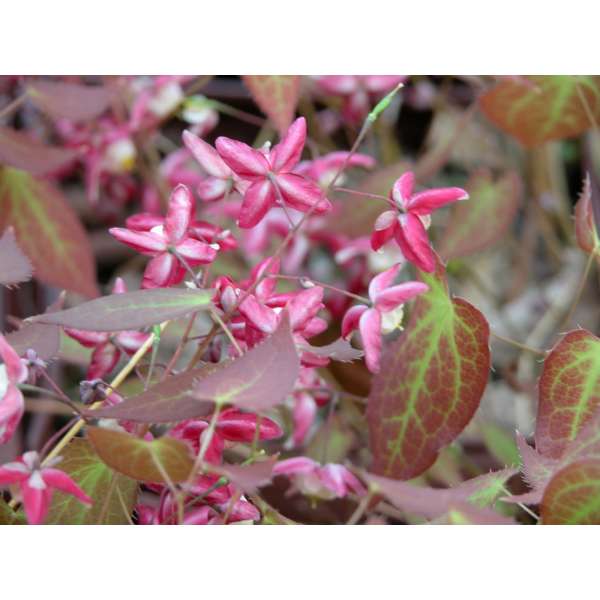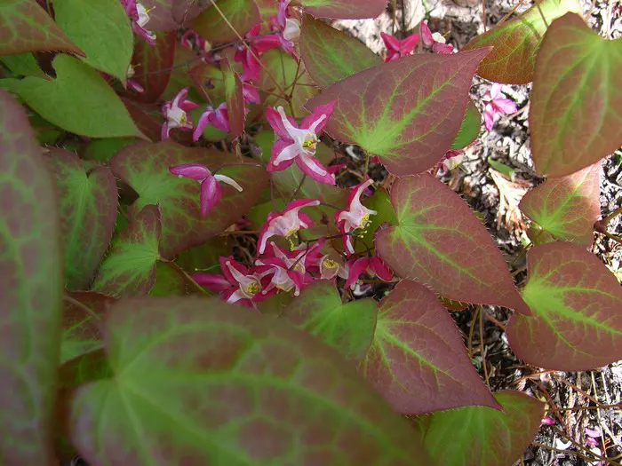 Epimedium x rubrum bloeit met kleine vleesroze bloemen gemengd met wit.