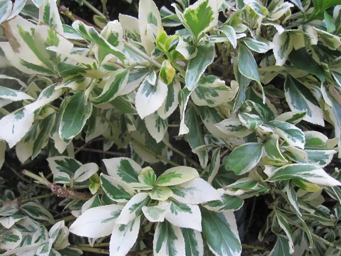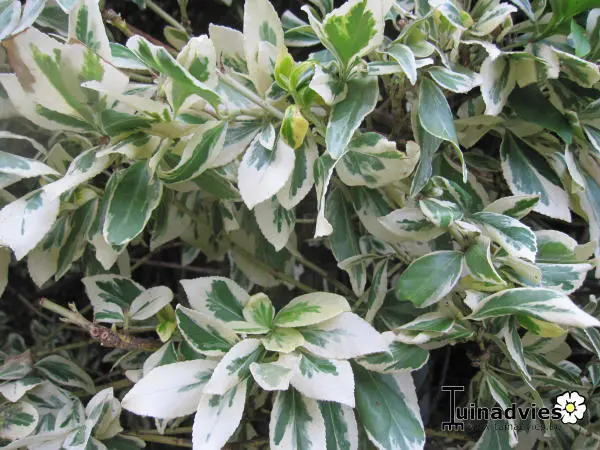 Euonymus fortunei 'Dandel' is een compacte struik met opvallende decoratieve bladeren, verschillende tinten van grijsgroen met brede cremkleurige randen.