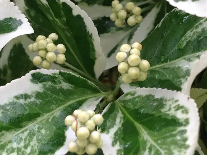 De bloei is onopvallend maar het blad is bij deze heesters des te meer.