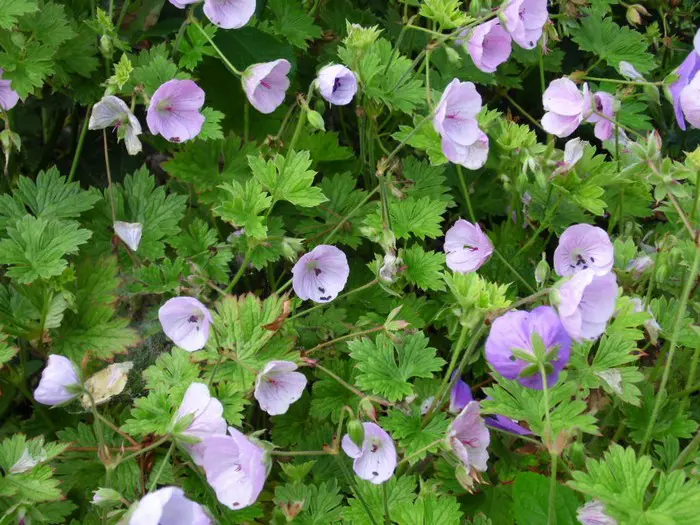 Bloeit rijkelijk tot de vorst met grote lila mauve tot bleek lavendelblauwe bloemen, duidelijk paars geaderd.