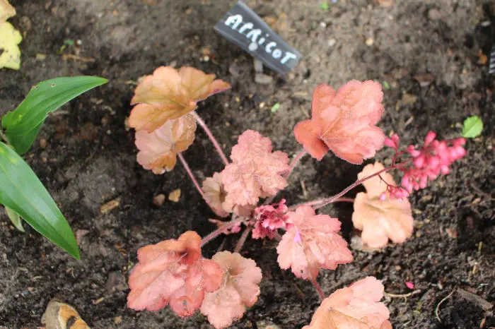 Heuchera 'Apricot' heeft abrikoosroze/oranjebruine bladeren en bloeit langdurig met roze ijle bloemen op lange fijne stelen.