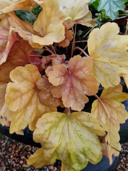Het blad is erg decoratief, verkleurt van perzik naar goud tot champagnegoud met een zilverwitte sluier eroverheen.