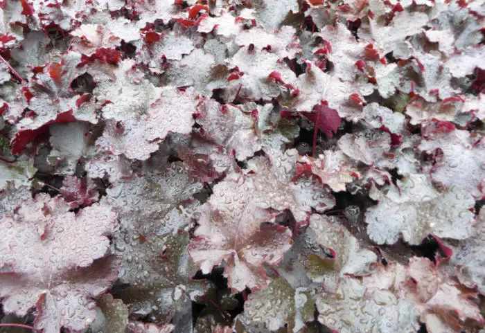 Heuchera heeft zogenaamde wortelbladeren, die met een lange steel direct aan de wortel van de plant vastzitten. De bladeren van alle Heuchera-soorten zijn sierlijk hartvormig.