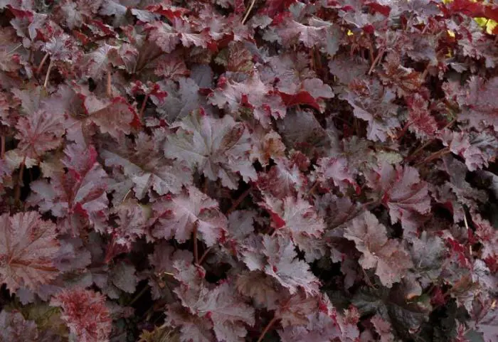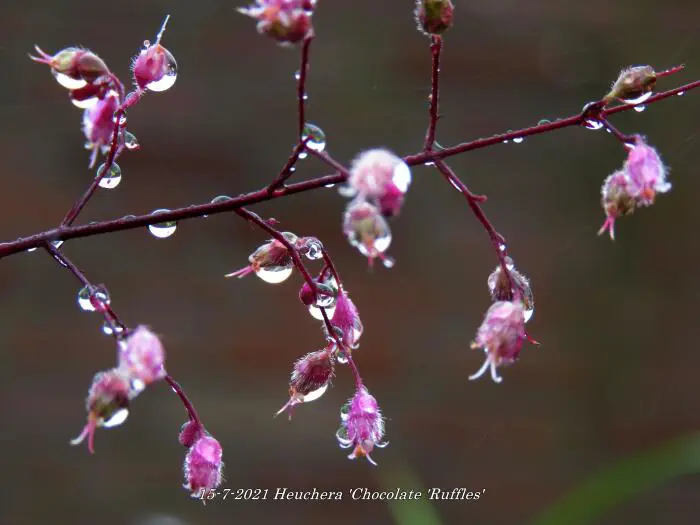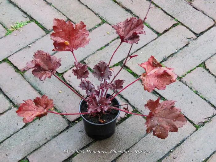 Heuchera 'Chocolate 'Ruffles' heeft een chocoladebruin gekarteld blad en witte bloei.