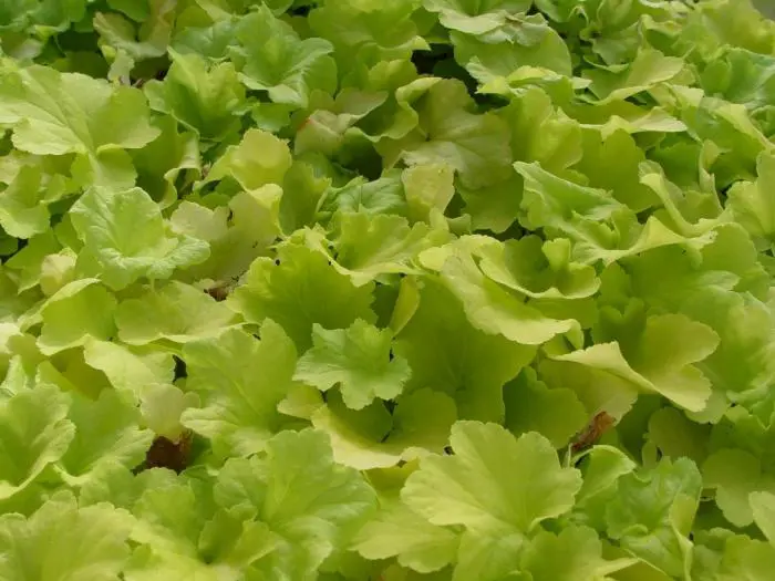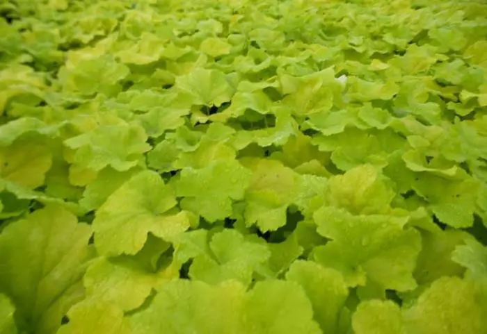 Het blad van de Heuchera 'Citronelle' is citroengeel met een zilverachtige onderkant. De kleur is intenser op een schaduwrijke plaats.