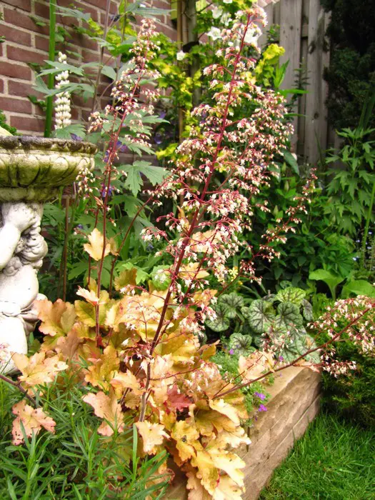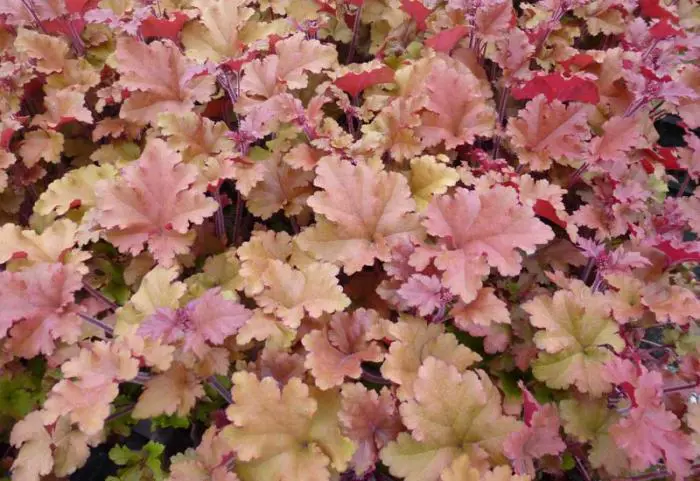 Heuchera 'Marmalade' heeft een mix van bronsgoud/oranje/groengeel/beige/roze/rood blad en bloeit wit.