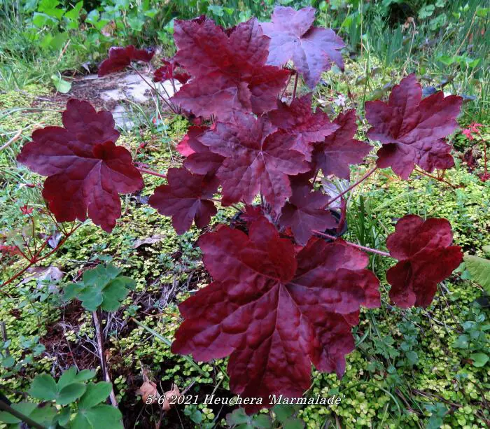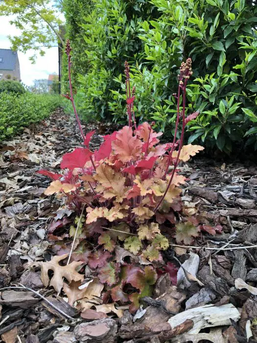 Deze Heuchera is ééntje uit de Marmalade-serie. Kenmerkend zijn de leerachtige, gegolfde dikke bladeren.