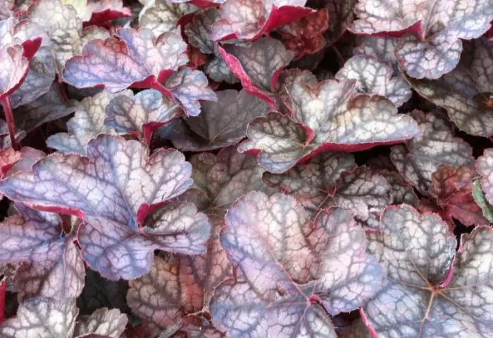Heuchera 'Regina' heeft een roodbruin/zilver gemarmerd blad met cremewitte bloei.