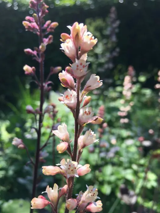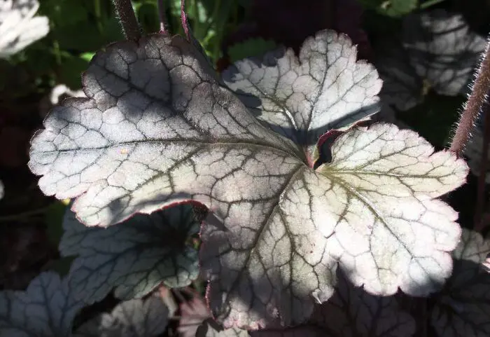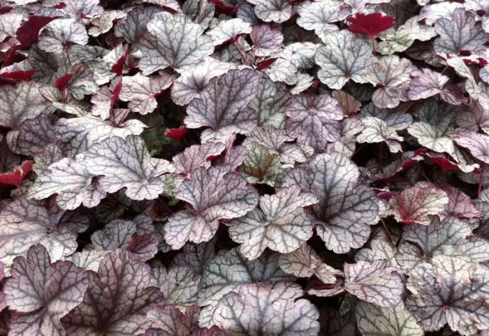 Heuchera 'Silver Scrolls' heeft zilvergrijs/paars gemarmerd blad met witte bloei.