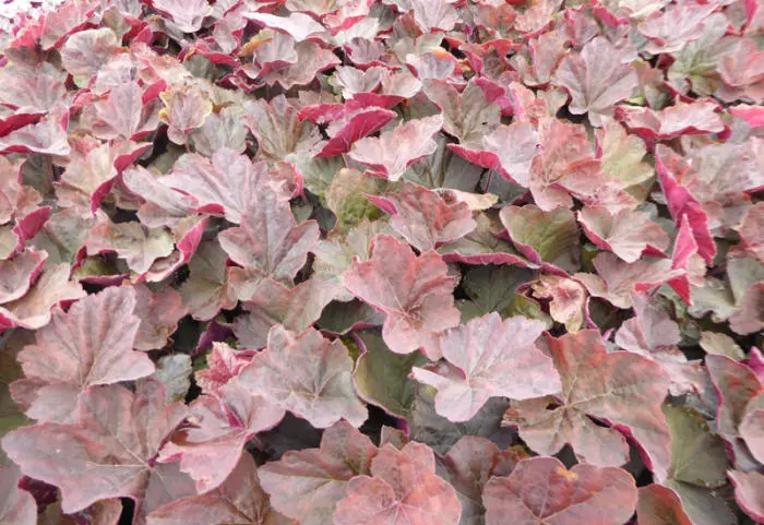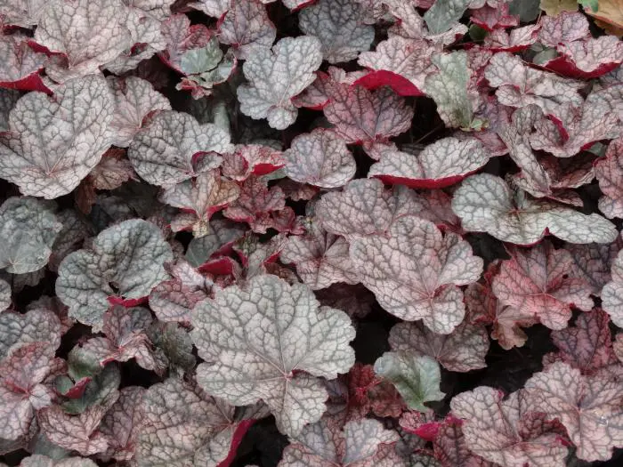 De bladeren van Heuchera 'Magnum' zijn groot en erg decoratief met hun bronsbruine kleur.