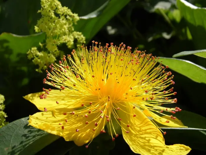 Hypericum calycinum bloeit de hele zomer met grote, felgele, gegolfde bloemen met lange centrale meeldraden, gedragen op slanke stengels boven groen blad.