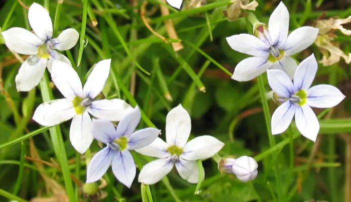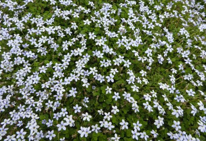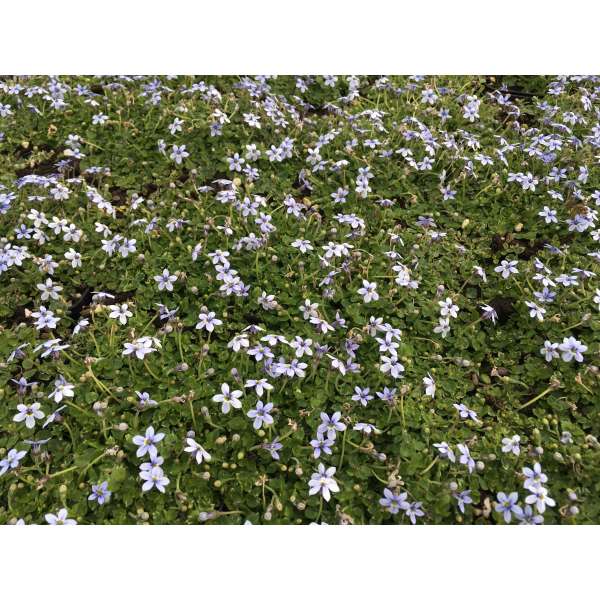 Isotoma fluviatilis 'Dark Blue' oorspronkelijk uit Australië, vormt een dicht tapijt van smalle lancetvormige bladeren en goed vertakte stengels met ontelbare enkelvoudige stervormige donkerblauwe bloempjes.