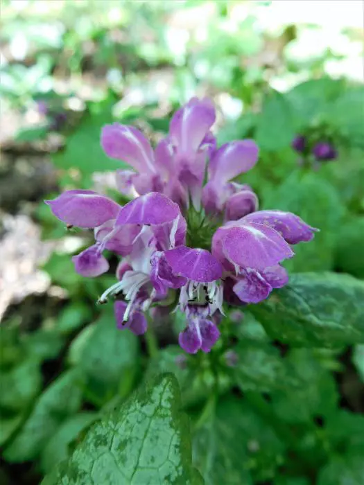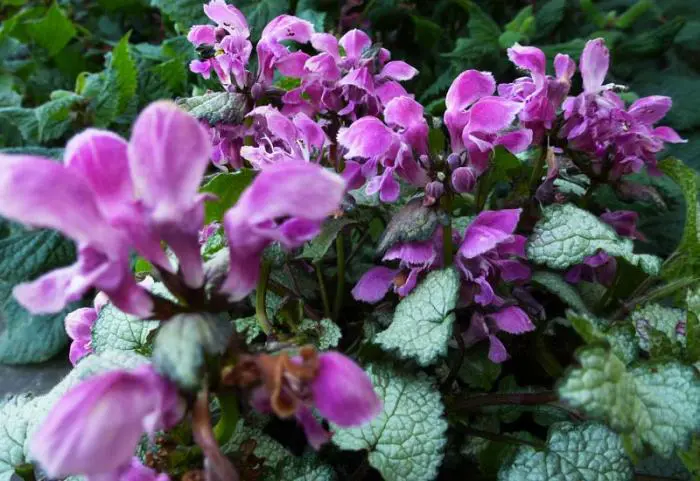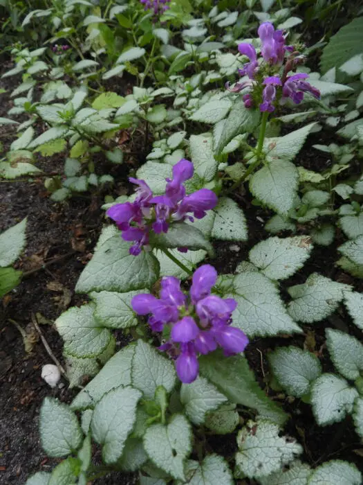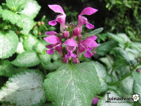 Lamium maculatum 'Beacon Silver' bloeit donkerlila, heeft zilverwit blad met groene randen. Het blad wordt groener naarmate ze donkerder staan.