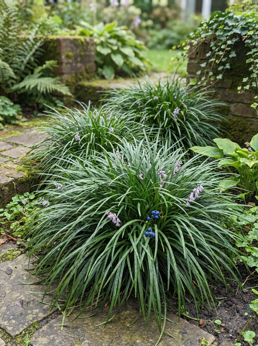 Ophiopogon japonicus afkomstig uit China, Vietnam, India en Japan, wordt vooral aangeplant voor het bladhoudend grasachtige loof dat tijdens de winter ook mooi blijft. De donkergroene bladeren zijn lineair, 20/40cm lang.