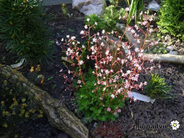 Saxifraga x urbium 'Clarence Elliot' is een bodembedekkende plant met rozetten van vlezige, glanzend donkergroene lepelvormige blaadjes.