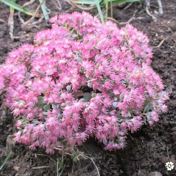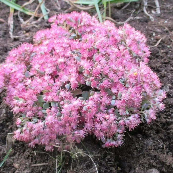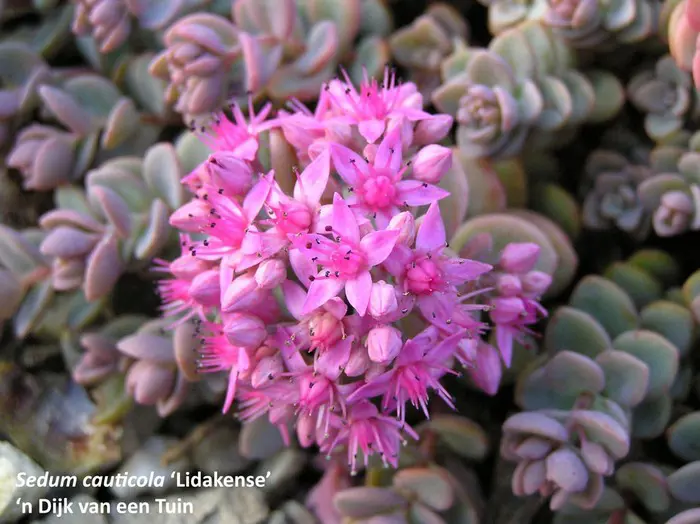 Hylotelephium cauticola 'Lidakense' is een rotsplantje met prachtige frambozenroze bloemschermen en grijsblauw sappig blad met een rode rand.