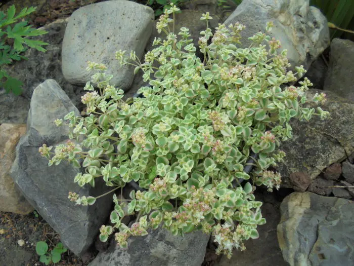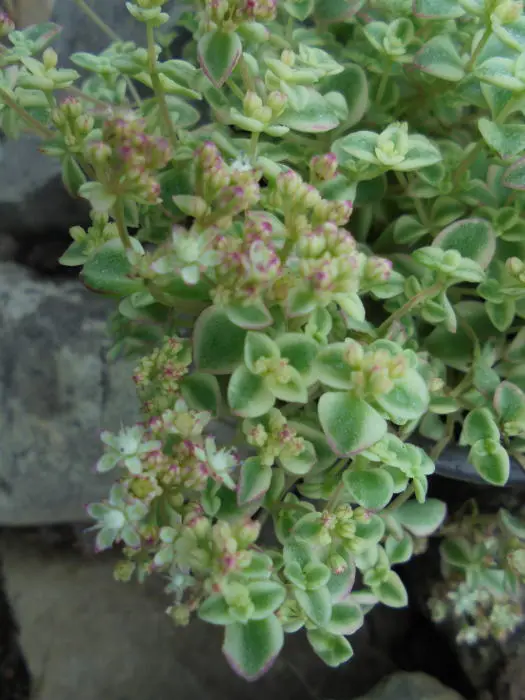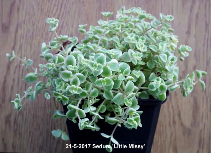 Sedum 'Little Missy' is een bodembedekkende vetplant met losse rozetten van vlezige ovale tot ronde blaadjes. Het blad is grijsgroen met iets roze en cremekleurige randen.