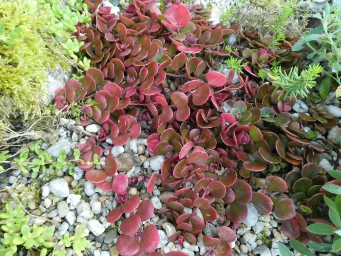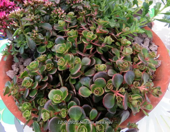 Sedum makinoi is een laaggroeiende vetplant met aan rode steeltjes, vlezige groene blaadjes en gele bloempjes.