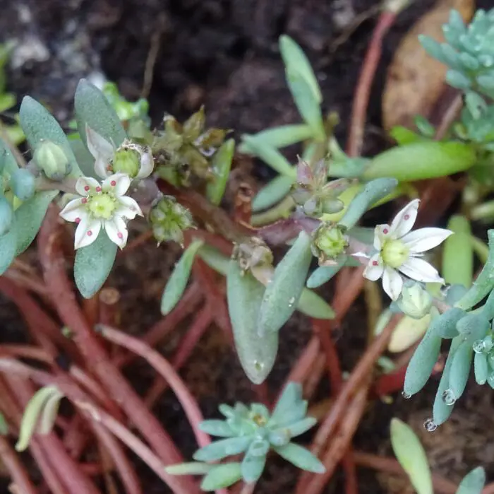 Sedum nevii 'Silver Frost' vormt dichte rozetten van sappige, ronde zilvergrijs-groene bladeren met een bronzen tint in de zomer.