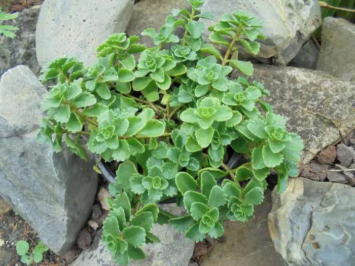 Een rotsplantje met overhangende groeiwijze.