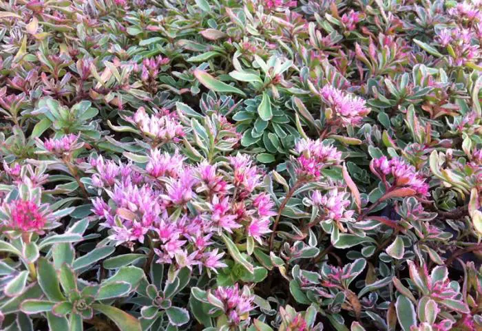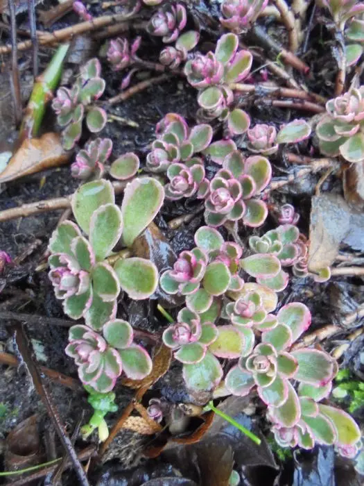 Sedum spurium 'Variegatum' is een bodembedekkende vetplant met getande spatelvormige bladeren. Witbonte groene bladeren met roze zweem.