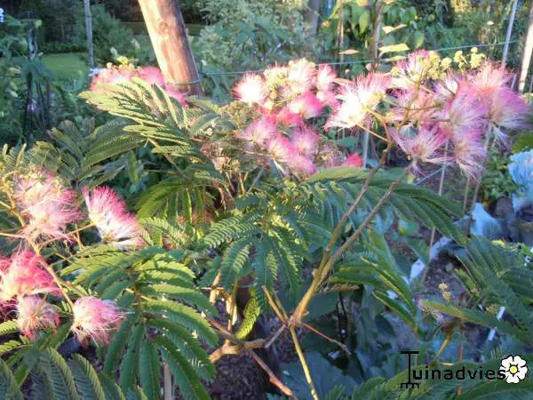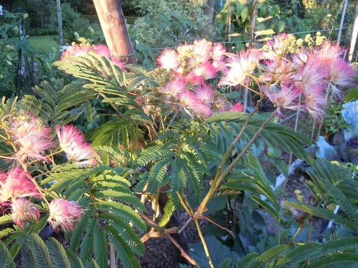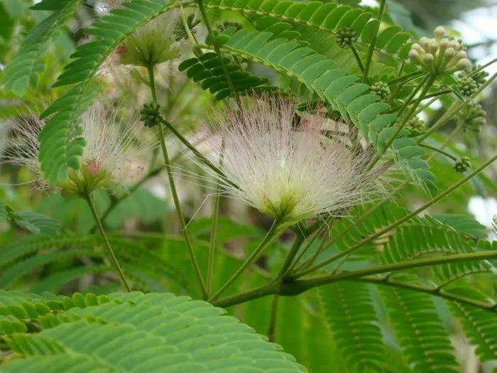 Albizia julibrissin var. Ernest wilson is een snelgroeiende, bladverliezende boom met een brede kroon en prachtige gevederde bladeren die 's nachts dichtvouwen.