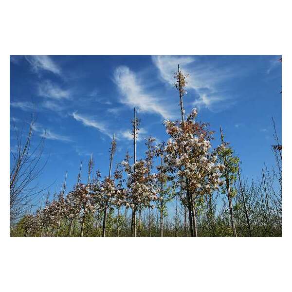 Amelanchier arborea 'Robin Hill' is een grote boomH.8m. met een vrij smalle groeiwijze met grijsgroene bladeren die in het najaar prachtig verkleuren naar geel, oranje en rood.