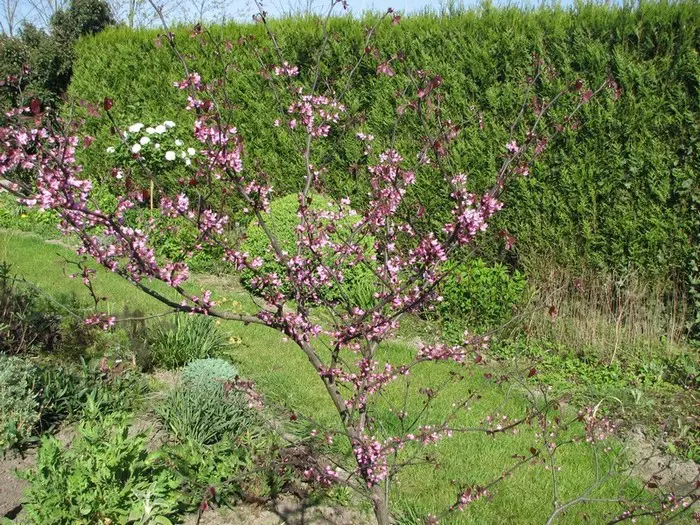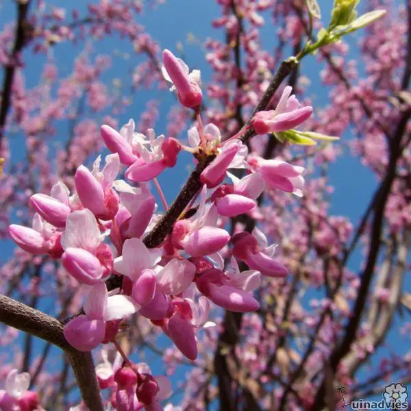 Bloeit in het voorjaar met trosjes van roze bloemen op kale takken.