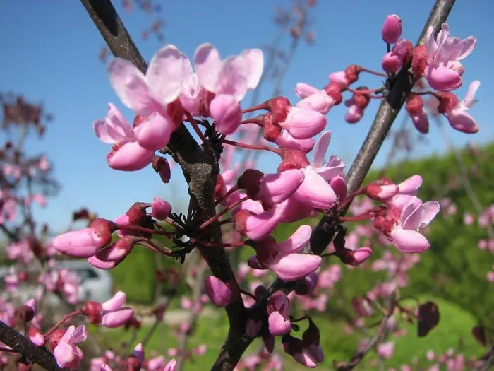 Cercis canadensis vormt een breed spreidende, opgaande, vaak meerstammige boom met een grijze stam waarvan de schors bij oudere bomen met kleine plaatjes kan loskomen.