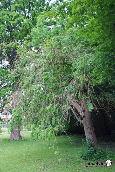 Fraxinus excelsior 'Pendula' is een treures met afhangende takken wordt dan ook vaak als prieelboom gebruikt.De bladeren zijn donkergroen, samengesteld oneven geveerd en kleurt mooi geel in het najaar.