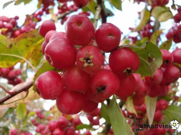 Malus ‘Evereste’ heeft een half open, pyramidale kroon en bloeit met roze/witte appelbloesems, de appeltjes zijn rood/oranje.