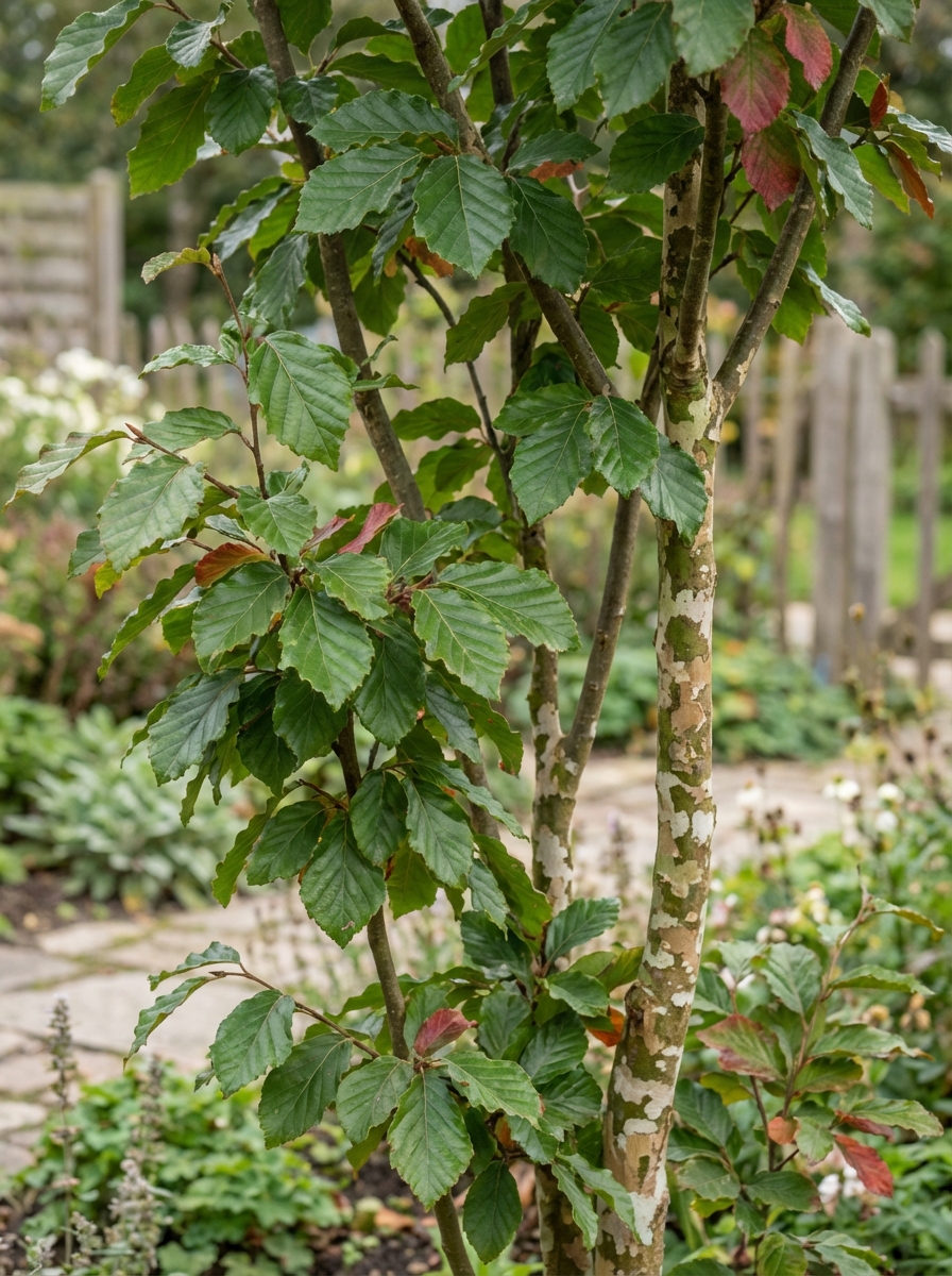 De stam van oudere bomen is zeer decoratief met zijn lichtgrijze schors en paarsbruine vlekken met afbladerende schorsplaten