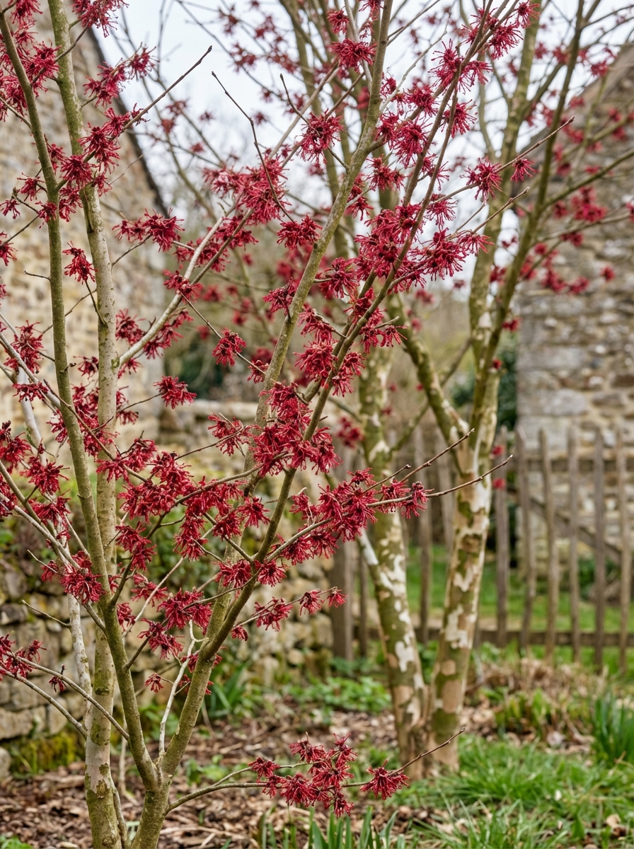 Oudere bomen bloeien in de vroege lente met rode kleine bloempjes.