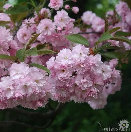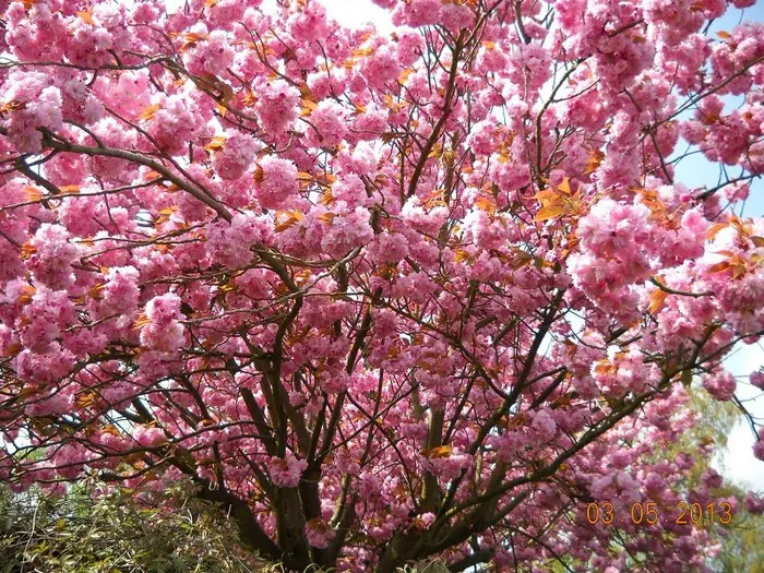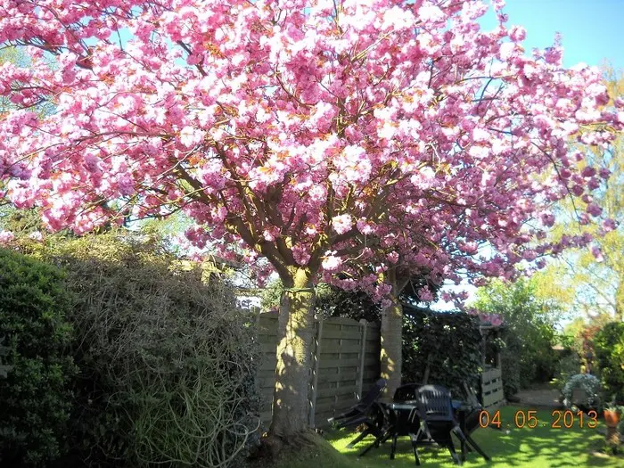 'Kanzan' syn. Prunus serrulata 'Sekiyama' met gevulde bloemen.
