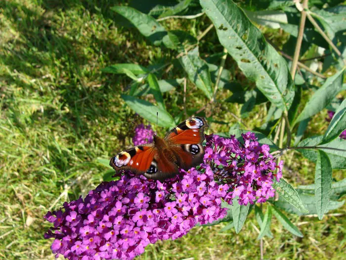 Buddleja davidii ’Nanho Purple’ blijft veel lager tot 150cm en bloeit met paarsrode pluimvormige bloemen.