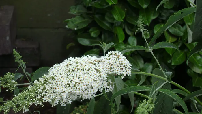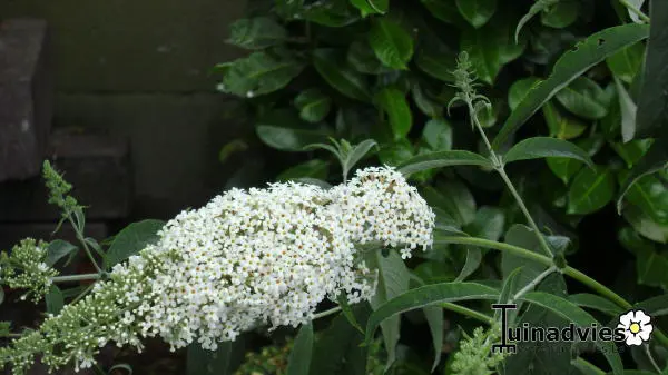 Buddleja davidii ’Nanho White’ blijft veel lager tot 150cm en bloeit met witte pluimvormige bloemen.