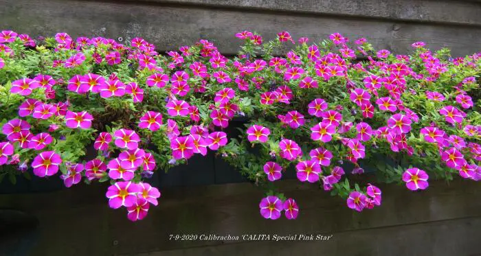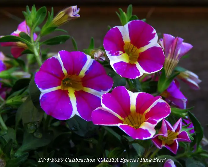 Calibrachoa 'Calita Special Pink Star' heeft een matig hangende groeiwijze en bloeit paarsroze met 5 witte strepen en geel in de keel.
